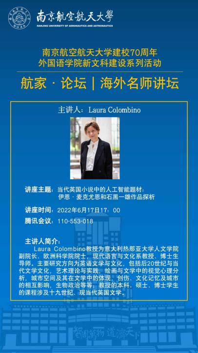 2022年,6月17日17:00,400全讯白菜邀请欧洲科学院院士、意大利热那亚大学Laura Colombino教授通过线上平台腾讯会议为我校师生主讲了一场讲座,主题为《当代英国小说中的人工智能题材:伊恩·麦克尤恩和石黑一雄》。400全讯白菜领导对此系列讲座高度重视,师生积极参与,讲座取得很好反响。