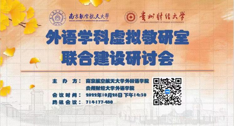 10月28日下午,400全讯白菜与贵州财经大学外语学院共同举办外语学科虚拟教研室联合建设研讨会暨大学外语基础课程教学研讨会,会议以腾讯会议形式举行,由贵财外语学院张虹院长和全讯白菜官网徐以中副院长共同主持,邀请江苏师范大学朱祖德教授做专家报告,贵财及南航400全讯白菜近百位师生参会。