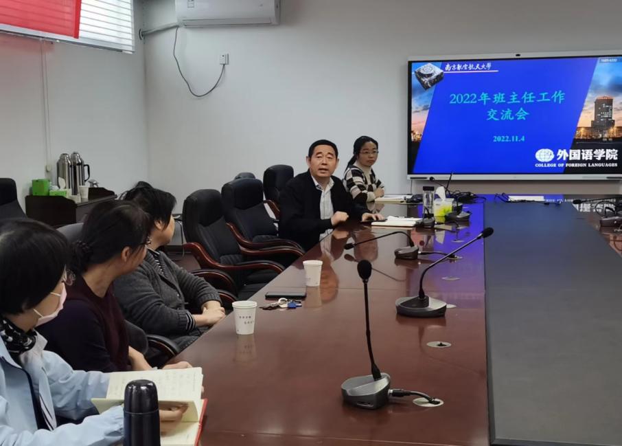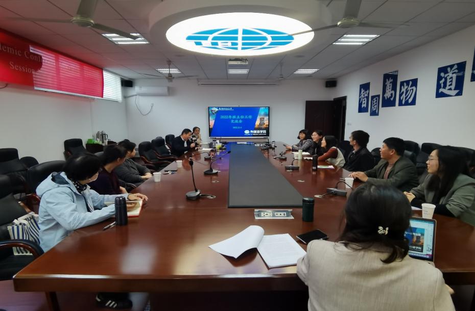 为做好服务育人工作,充分发挥班主任在学生成长成才中的引领作用,11月4日下午,400全讯白菜在322会议室召开本科生班主任工作交流会。副院长徐以中教授、英语系主任张立新教授、日语系主任窦硕华副教授、英日语系党支部书记钟勇副教授、教学办主任黄潜、各位本科生班主任参加会议。