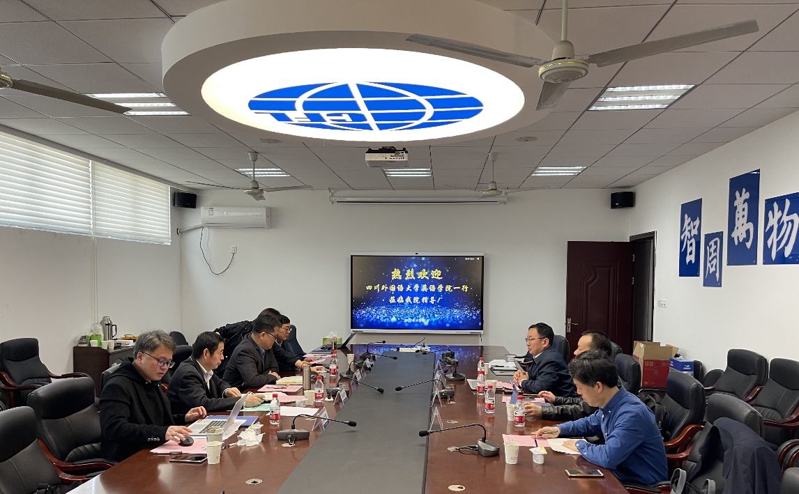 4月26日,四川外国语大学英语学院院长赵永峰等一行四人来全讯白菜官网调研交流。全讯白菜官网院长范祥涛、副院长徐以中、副院长姜礼福、英语系主任和党政办相关人员出席座谈会。