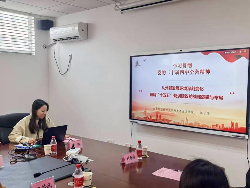 陈子烨围绕党的二十届四中全会精神进行领学,并作题为《从外部发展环境深刻变化理解“十五五”规划》的专题报告。她立足当前深刻变化的外部环境,系统解读了“十五五”规划中对外部发展环境的战略研判与应对部署,强调要以科学理论为指导,准确把握国家发展战略的逻辑与布局。